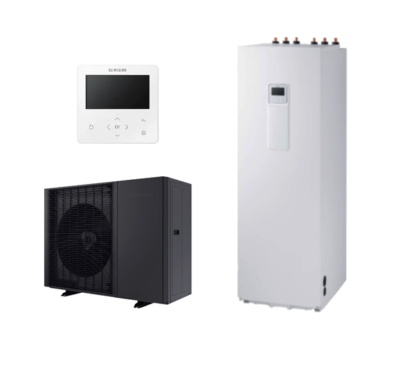 Unitate exterioară + modul hidraulic interior cu boiler incorporat. Flexibilitate crescută și performanță bună la temperaturi scăzute.